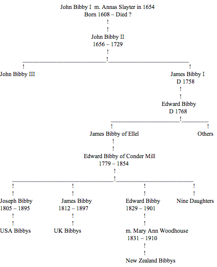 If this Edward Bibby was the son of the James Bibby who died in 1758 we have our ancestry traced back to John Bibby I who was born in 1608. The family tree would then be