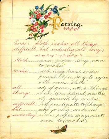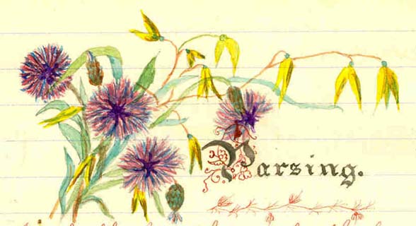 As for the fiddly, pretty little headings and footers… the children I showed couldn’t believe a thirteen year old could paint like that – and some claimed her mother must have done it. (but I think her mother might have been busy with other things – as women in those days had no automatic washing machines, or dishwashers, or any modern automated appliances, and, often had huge families compared with today!)