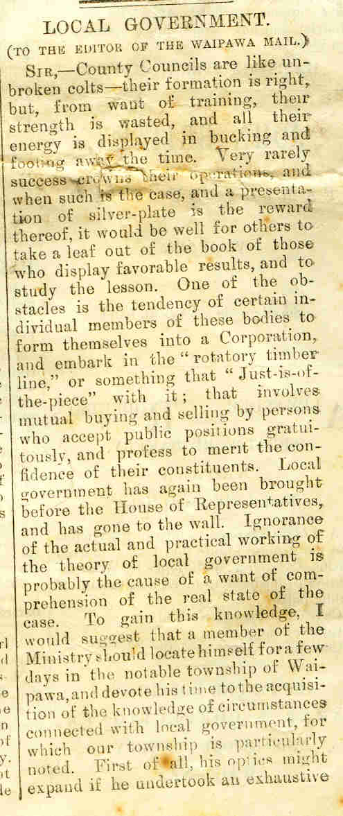 And yesterday Mum found the old Waipawa Mail (July 20 1883) and brought it over and I’ve scanned it. Unfortunately the letter was split over two pages and the paper is old and so has a few little holes and folds in it, making some of it hard to read.
