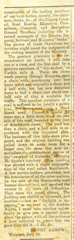 I don’t quite understand everything Henry is getting at – especially at the beginning of the article – but defiantly when you get on to the second page you can see him making quite pointed remarks about ‘the little store … which was pulled down to make room for a larger one’ is definitely the Bibby store… ‘which caused all the other boundaries of the sections of Ruataniwha Road to become disorganized.’