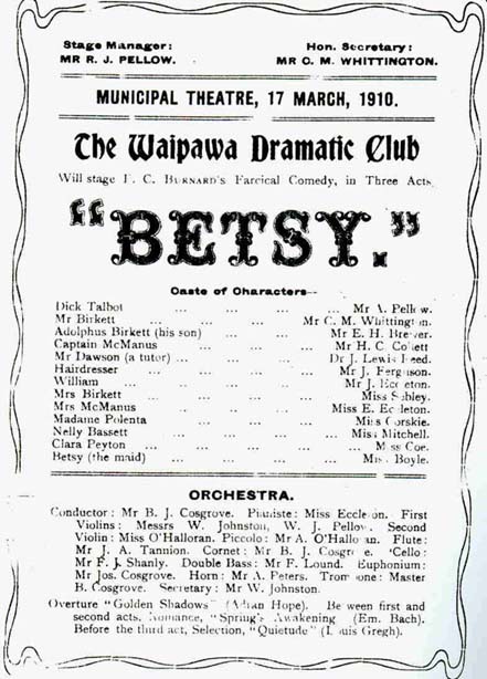 The Municipal Theatre is the home of Waipawa’s Musical and Dramatic Society which have been performing in Waipawa since 1898. Originally they performed in the Oddfellows Hall, but in 1910 they celebrated the opening of the new theatre by performing’ Betsy’ but this time with new, coloured, electric lights!