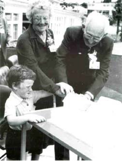 Cutting the cake at the jubilee is the youngest pupil, James Chote (aged5), the oldest pupil, E.S. Bibby, and the earliest registration Mrs Berta Begley (nee McIntyre).